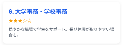一般事務、受付、大学事務などは、業務内容が明確で時間管理がしやすい職種です。「今日は定時で帰れるかな」と毎日ヒヤヒヤする必要がなく、安心して働けます。