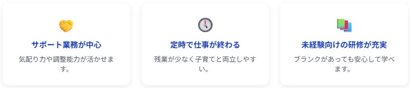 - 定時で終わる仕事が多く子育てとの両立がしやすい