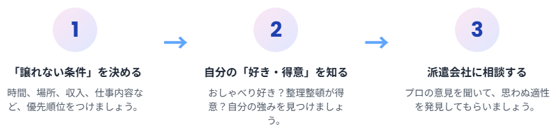 「ランキングはわかったけど、結局自分に何が合うの?」という方へ。仕事選びで失敗しないための3つのステップをご紹介します。これらのステップを踏むことで、自分に本当に合った仕事を見つけられる確率が格段に高まります。