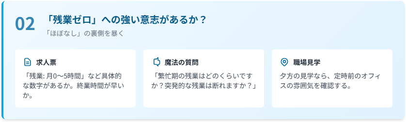 残業に関しては、求人票の表面的な情報だけでは不十分です。以下の質問で、隠れた残業リスクをあぶり出しましょう。
