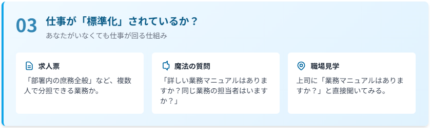 業務の標準化レベルは、求人票の以下の部分から読み取ることができます。