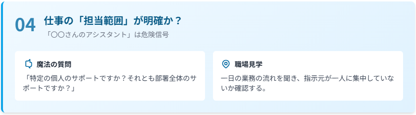 特徴4:仕事の「担当範囲」が明確か?「〇〇さんのアシスタント」は危険信号!