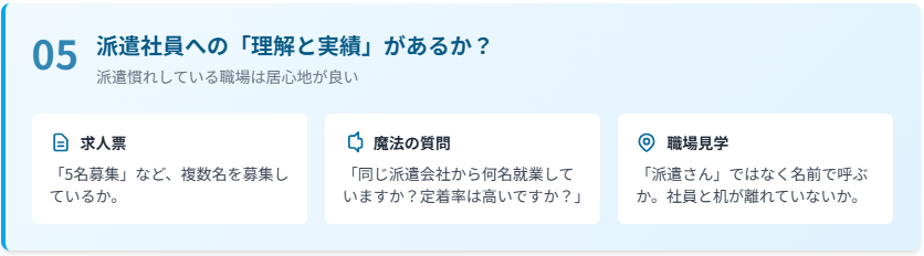 特徴5:派遣社員への「理解と実績」があるか?派遣慣れしている職場は、居心地がいい
