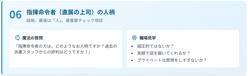 「今回、指揮命令者となる〇〇様は、どのようなお人柄の方ですか? これまで、〇〇様の下で働いた派遣スタッフの方からは、どのような評判を伺っていますか?」