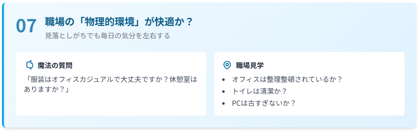 服装の自由度や、休憩スペースの有無は、その会社のカルチャーを反映します。スーツ必須の職場は比較的堅い文化、オフィスカジュアルOKの職場は柔軟な文化である可能性が高いです。