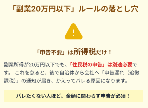 - 「20万円以下」ルールを鵜呑みにしない:住民税の申告は必須。申告こそがバレ対策の第一歩