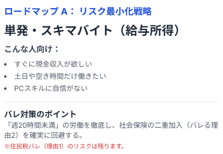 ロードマップA:バレるリスクを「最小化」したい → 『単発・スキマバイト』(給与所得)