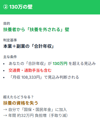 こちらは配偶者や親の社会保険の扶養に入っている方が気にすべき壁です。判定基準はあなたの「合計年収」(本業+副業、交通費等も含む)で決まる。