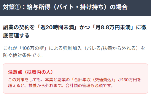 対策として、副業先で「106万の壁」の条件(週20時間等)を満たさないようにし、かつ、本業と副業の「合計年収(交通費込)」も130万円未満に抑える。