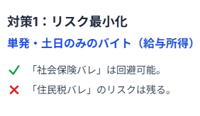 - リスク最小化:単発バイトで社保回避(住民税バレリスクは残る)