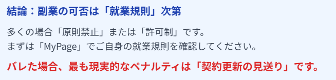 「スタッフサービス 副業禁止」かどうかは、あなたのMyPageにある就業規則次第だ。しかし、禁止・許可制に関わらず、バレた時のペナルティ(契約更新しない)は、あなたのキャリアにとって非常に大きな損失となるのですよね。