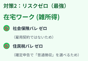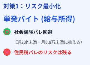 - リスク最小化:単発バイトで社会保険バレを回避(住民税リスク残)