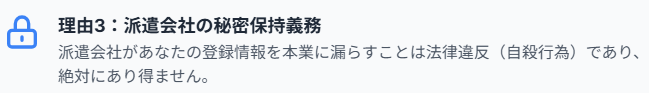 • 派遣会社は法律で登録情報の秘密保持義務を負っている