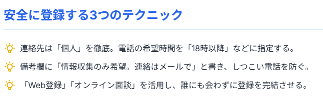 • 「登録だけ 連絡くる」という不安も、連絡先を個人携帯・個人メールに限定すれば回避可能