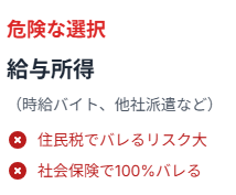 • 給与所得の副業を選ぶと住民税・社会保険でバレるリスクが発生