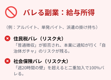 • 「給与所得」の副業には、住民税バレと社会保険バレという致命的な2大リスクが存在する