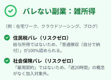 • 「雑所得」なら、普通徴収が100%認められ、社会保険の対象外となるため、バレるリスクが完全にゼロになる