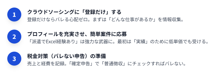あなたの派遣スキル(事務、OA、専門職)は、あなたが思っている以上に「雑所得」の市場で価値があります。「派遣 副業 ok」な会社を探したり、バレる不安に怯えながら「給与所得」のバイトをしたりするより、バレるリスクがゼロになる「雑所得」の在宅ワークという、最強の選択をしてください。