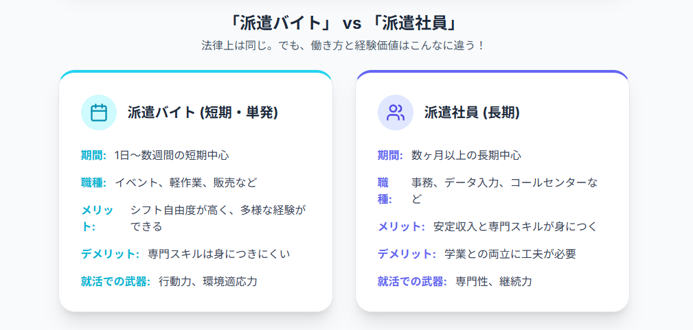 法律上は同じでも、大学生のあなたにとって、短期の「派遣バイト」と長期の「派遣社員」では、働き方の経験価値や注意点が大きく異なります。
