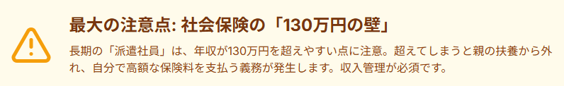 - 最大の注意点: 長時間働く「派遣社員」は、社会保険の加入条件に触れやすい「130万円の壁」に要注意