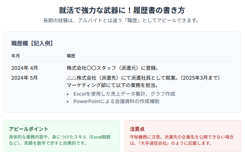 - 就活でのメリット: 長期で働く「派遣社員」の経験は、専門スキルや継続力を示す職歴として強力な武器になる