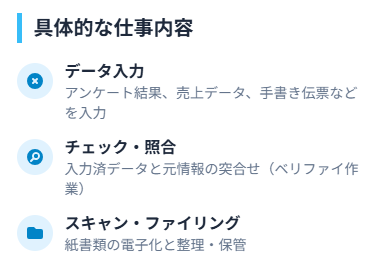 - 入力だけでなく、チェック・照合・ファイリング作業も含む