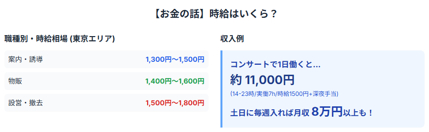 設営・撤去スタッフ | 1,500円〜1,800円 | 体力的にきついため高時給 |