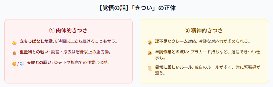 ここからはキラキラしたイメージの裏側、この仕事の「きつさ」について正直に話します。結論から言うと、巷で言われる「きつい」は、100%本当です。