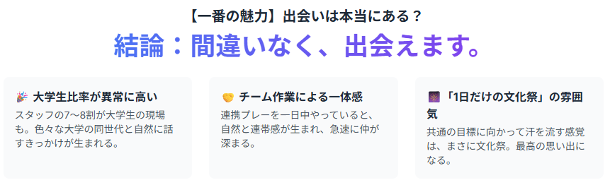 - 間違いなく出会える(スタッフの7〜8割が大学生)