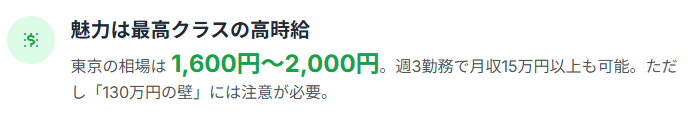- 時給1,600円〜2,000円(東京)が相場で、大学生バイトとしては最高クラス