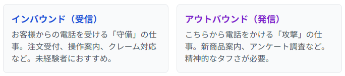 - 仕事内容はインバウンド(受信)とアウトバウンド(発信)の2種類