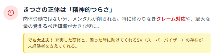 - きつさの9割は精神的なもので、特にクレーム対応が過酷