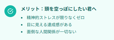 - 精神的ストレスが限りなくゼロ:クレーム対応も、複雑な人間関係も、難しい判断も一切ない