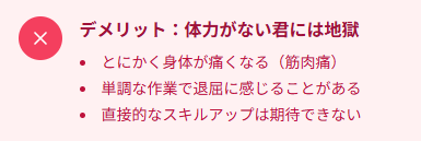 - スキルアップは期待できない:この仕事で得られるスキルは、他の職種で直接活かせるものではない