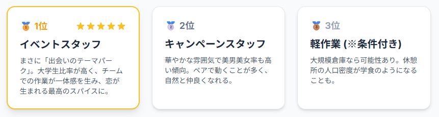 - 出会える職種ランキング: 1位.イベントスタッフ、2位.キャンペーンスタッフ、3位.販売スタッフ。