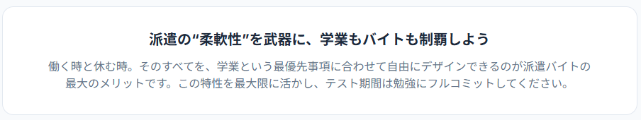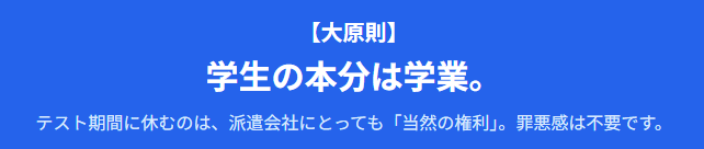 - 大原則:学生の本分は学業。テスト期間に休むのは派遣会社にとっても「当然の権利」