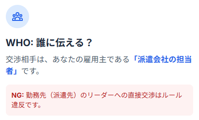 - 交渉相手:勤務先のリーダーではなく、必ず「派遣会社の担当者」に連絡する