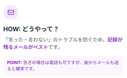 - 伝える手段:記録が残るメールがベスト。急ぎの場合は電話も可