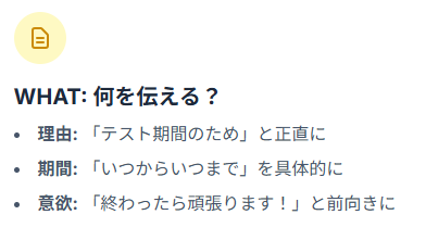 - 伝える内容:「テスト期間のため」という正直な理由と、「いつからいつまで」という具体的な期間