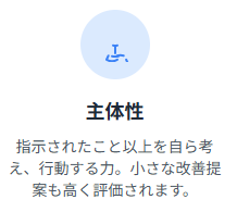 主体性 | 作業効率化の提案、お客様への気遣い | 指示待ちではなく、自ら課題を見つけて動ける |