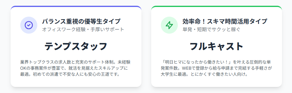 - 単発特化型:とにかく授業の合間や休日1日だけ働きたいなら「フルキャスト」「ランスタッド」